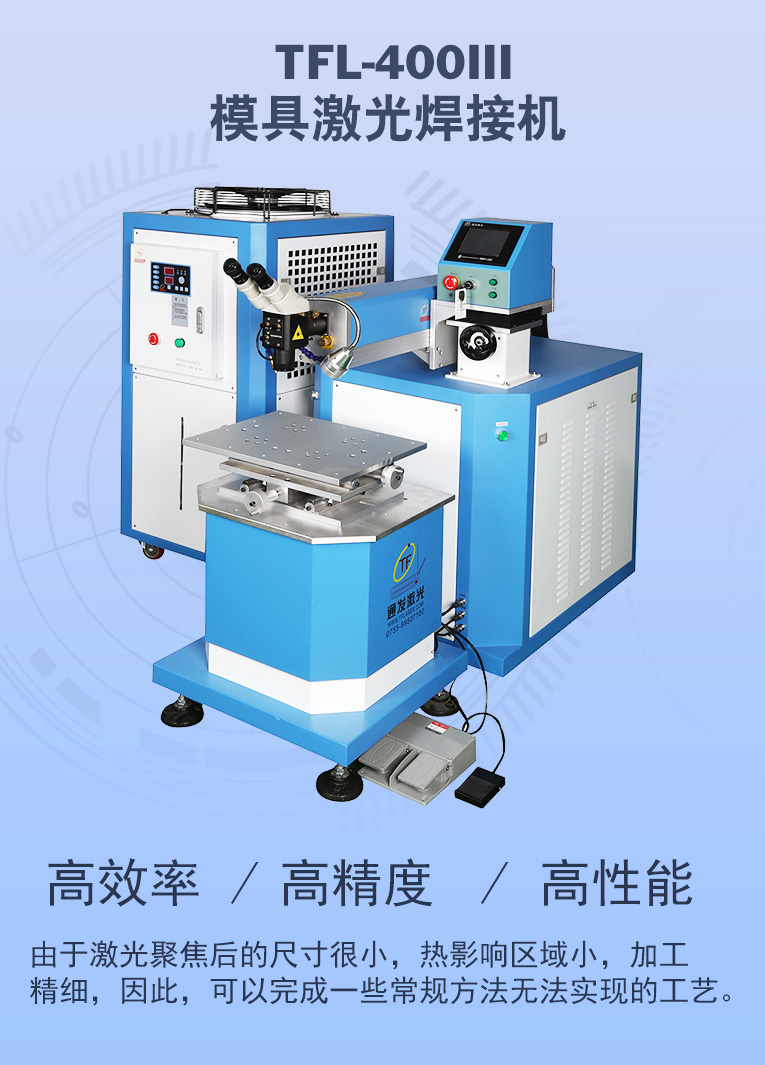 TFL-400Ⅲ型模具激光焊機(jī)是通發(fā)激光公司自主研發(fā)的一款大功率激光焊接機(jī),采用通發(fā)自主研發(fā)的二代精密雙燈電源為燈泵浦驅(qū)動電源,配置觸摸屏,操作更方便。主機(jī)具備激光頭手搖升降與工作臺按鈕電動升降實(shí)現(xiàn)焊接不同厚度模具的激光焊加工。本款機(jī)型更適用于各類大功率、大面積激光修補(bǔ)的模具。由于激光功率大,同時可激光焊接鈹銅模具,鋁材模具或鋁材零件。在大面積激光修補(bǔ)模具時,可以使用更粗的焊絲,激光焊接效率大幅提升。